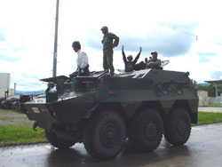 | なんとかUターンしてランナーの後をそろそろとついてやり過ごして 駐屯地まで戻り、演習を見学。偵察機に戦車、装甲車、ヘリコプターなどなど 空砲の音にびっくりしながら(BGMにサンダーバードはかなり笑えた) 大コーフンっ、オートバイの演習はかなーーーりカッコよかった! |