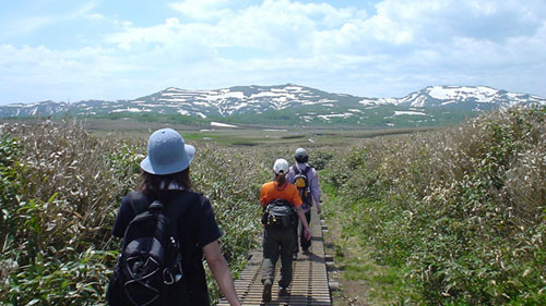 ![]() 急に広がる湿原、左に南暑寒岳、右に暑寒別岳。 |