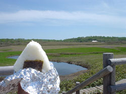 作ってくれたおにぎりと、 昨日のオニオングラタンの残りの フランスパンにハスカップジャムを つけてランチ♪ 相変わらず、虫は多いけれど 長そでを着てやりすごす。 しばし食後の休憩をして、 周遊しようかと思ったけれど 雲行きがあやしくなって来たのと 時間があまりないので ちょこっとだけ歩いて引き返すことに。 |