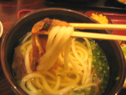 | 私はひと玉たべたあとだったので、ふつうにぶっかけ。 (・(エ)・)はお腹がすいたらしく、ここの名物、釜ぶっかけとちらしずし。 おいしゅうございました、透明なおだしがはじめてだったのでちょっと感動。 「へぇ、これがいわゆるさぬきうどんかぁ」 と写真を撮って掲示板にUPして、食事を済ませる。 これ全部で¥1150かぁ、お店の雰囲気と合わせると すっごく良心的な値段だわ♪ |