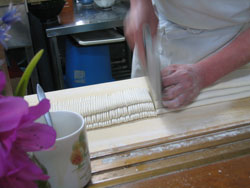 ![]() 目の前では、めん棒でのばした麺をたたんで 手際良くトントン切っていきます。 |