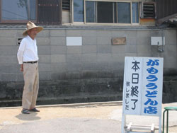 | キャンプ場より一番遠い(約40km)のでけっこう時間がかかってしまい こんぴらさんの近くだっていうのに全く脇目もふらずにまっすぐ、 んでもって、8:50に到着、げげっ、すでにけっこう並んでる〜 30分ほど待って、いよいよ店内へ。伝票に自分の名前とメニューを書き込む。 行く前に、やなぎちゃんから「天ぷら食べちゃうと、あとあと苦しくなって ラリーにはきついよぅ」と警告されていたので、おとなしく 彼女おすすめの「ひやあつ」(麺が冷たく、だしがあったかい)の 小にしておく。運良くカウンター席に座れたので 目の前で麺の出来る行程をみながら、うどんを待つ♪ 店のおじちゃんたちの、ゆる〜い讃岐弁が聞いてて楽しい。 |