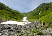 順調に大樺沢二俣へ11:00に到着、雪渓のうえにてランチ。 雪の上だけに風は涼しくていいのだけど、反射でかなり日ざしがキツい。。 SPF50の日焼けどめもむなしく、ジリジリ腕が焼けていくのが分かる(>_<;イヤ〜 しばしの休憩後12:15に二又を右又へ、たくさんのお花をみながら やっぱりの急勾配を登っていく、あまりの暑さにまたまた水を飲む〜 ここらへんにくるとかなり標高も高いので涼しいのだけど 空気も薄いせいか、10mも登るとすぐ息がきれる。ちょこちょこ休んでは登る。 |