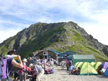 | 15:00に稜線分岐、小太郎尾根から美しい稜線を眺めながら、 の〜んびり歩く事50分、「テントが見えてきたよ!!」 そして16:00に肩ノ小屋にやっとこさ到着、さっそくビールを買って みんなでカンパ〜イ! そして早い山小屋の夕食、17:00には夕飯を済ませて (メニュー:味付き焼肉、芥子菜漬け、ちょこっとサラダ、ごはん、おみおつけ) 外で景色を満喫。。。のつもりがあらら、胃に血液がいってしまい 目眩がするわ〜っという感じで山小屋でダウン。 1時間程ぐーぐー寝てしまいました 起きるとOちゃんもおやすみ中、静かにコソリと抜け出して 外をみると丁度サンセットTime! 写真を撮っているとみるみるガスが上がってきて、 10分ほどですっかり曇ってしまいました。 寝る前にみんなで今日の感想など語りながらBeer Time、 20:00には果てて就寝zzz。。。 |