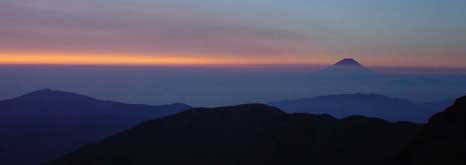 | 朝からごはんおかわりし、エネルギーチャージ! 04:45、そして待望のご来光、なにも言えません、美しすぎます、感動で涙が出ました。。。 雲海に浮かぶ富士山、鳳凰三山、中央・北アルプスetc.背の高い山だけがぽこぽこ頭を出しています。 |