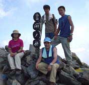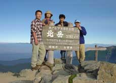 | 嫌な顔をする私に皆の衆「『イヤっていっても行くんでしょ』って顔してるよ」 しょうがない、ここまできたら行くしかないっしょ! ちきしょー!と 07:00、気合いを入れて再出発!めざすは間ノ岳!!! しかし、かなりのアップダウンが激しい崖っプチ山道、 景色を楽しむにも 足がすくんであんまり見れません。。。 北岳山荘をすぎて尾根沿いをあるくのが、 とってもプチ縦走感満点、 中白峰(3055m)をこえたあたりでお昼をとります、男性陣は山小屋特製弁当 私は荷物を減らしたいので大量に持ってきた行動食のカロリーメイト、 チーカマを片付ける そしてここにザックをおいて、残りの行程を頑張りました。 10:40間ノ岳登頂!関西方面からいらっしゃった オバちゃんにシャッターを切ってもらう、 後ろで荷物をほどいている方に「ちょっと〜!写真とるから、しゃがんでもらえます〜」 と嬉しくもあつかましい発言に笑う私にオバちゃんは 「そのうちアナタもこうなるんやで〜」 と言います、ハイ、オバちゃんはこの世でイチバン強そうです。 |