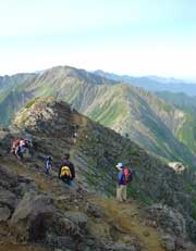 | [02.07.28] 晴れ 07:30ころ暑くて目が覚める、起き抜けにいきなりごはんを食べていた音で 皆がぽつぽつ起きはじめ、支度を整え国民宿舎で用を足し(女のコにはカナリ重要) 09:00に登山道へ入る、吊り橋を渡ってすぐの急勾配に唖然 「イキナリこれかよっ」と、さま〜ず三村ばりのツッコミをしながら登り始めるが、期待でルンルンな一行は 結構ハイペースで大樺沢沿いをぐんぐん登る、沢沿いはきもちがいい♪ やがて沢から離れてくると、晴天だったために「暑い〜、きつい〜」と汗がダラダラ出る、 持っている水分には限りがあるので、計画的に給水。凍らせてきたアミノバイタルは、みるみる溶けていく。。。 |