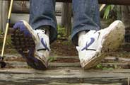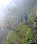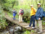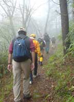 延々延々歩くのみ、普通のスニーカーだった I氏のソール片方がはがれてしまう アクシデントもありましたが、 ゆるい下山なので良かった。。。 途中霧のなかのカラマツ林が とっても幻想的だったので写真をパチリ、 (トップに貼付けています) ながい下山道から中島川橋へ到着。 舗装道路を作場平橋まで20分ほど 歩きます、整理運動をかねて後ろ向きで みんなで歩く姿は笑えました。 |