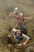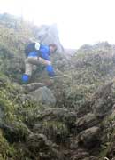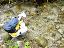 | 霧がかかっているので、湿気がすごい! 汗なのか霧なのか分からないけど、 顔がびっちょり。。。 スパッツとかっぱを忘れていたので、 ちょっと後悔…。 でも、気温が低いのでひんやりとして 気持ちよかったりして♪ (マイナスイオン効果?) 本谷できれいな川を渡ります、 水をさわると、とっても冷たいっ。 |