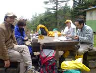 1時間も歩くと、ヤブ沢峠、 そこから10分ほど歩くと笠取小屋に到着。 まだお昼にはちょっと早かったけど、 水場もあってベンチ&テーブルもあるので ここで食事休憩、 小屋からちょこっと下った所にある水場では おいしい水がありました。 朝購入した、とっても大きなおむすびにかじりつきます、 そして食後には、わき水で入れた、 おいしいコーヒーとスイーツでしめくくり。 |