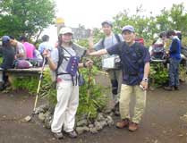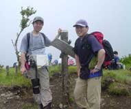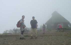 1列でぞろぞろ歩き、 標準コースタイム丁度1時間くらいでニノ塔到着。 このころからガスが登ってきてしまって、 なぁんも見えません。 とりあえず看板の前で記念撮影。 ここから三ノ塔までは10分ほどの尾根歩き、 ただ、木が多いので景観はのぞめない、 いっかい下って、三ノ塔の手前にまたまた階段っ、はぅ。。 到着したもののカンペキにガスのまっただなか、 まっしろけっけでなぁんも見えません。 |