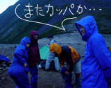 最終日、朝2:00、雨がテントをたたく音のなか(泣)、 TOMOEさんとちぃにぃちゃんの「今日どーしよっか?」と 話す声で起床。 まだ真っ暗、当初予定していたのは常念岳〜蝶ケ岳を縦走して三股へ下山。 行程がかなり長い長いルートなので、天候不順で行ってもネ…ということで |