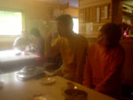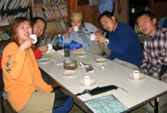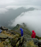 集合写真を撮って、さっさと退散。 下山道へ出るのも、周りは崖っぷちなので慎重に人の間をすり抜けて。。 これから登ってくる人とすれ違いながら、来た道を戻ります。 やっぱり海の日3連休、人は大勢上がって来ていますネ。 常念小屋には7:30ころ到着、山小屋の玄関は人がごったがえしていて 靴とカッパを脱ぐのも大変っ、そそくさと中へ逃げ込みます。 さて、これで後は下山ルートになるので、のんびり美味しいコーヒーと チョコレートでまったり休憩。 |