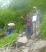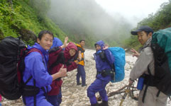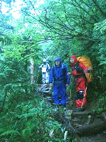 カッパとスパッツを、あれ? スパッツを、む〜〜〜〜〜んっ(汗) 嗚呼、スパッツのファスナー壊れてしまりましぇん〜(泣) う〜んと悩んでいると、テキパキとちぃにぃちゃんがテーピングでグルグルと 留めてくれました。ありがとうぉ(*^o^*) で、気を取り直して、8:30、常念小屋を出発です〜 急な下りなわりに、ちゃんと整備された道です、ただ、ぬかるんでいるので つるっと滑って尻もちを何度かついちゃいました。 お尻はドロンコです、丸太と木の根には要注意だわ。 「ぐっちゃ、ぐっちゃ」という足音をたてながら、歩きます。 |