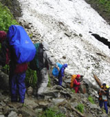 5:05に出発。 岩がつまった感じの登山道は、 多くの登山者が踏み固めたせいか、 しっかりとして歩きやすい、 色とりどりの蟻の行列のように 一列になって、登ります。 振り返ると昨日歩いてきた、登山道が見えます、 「う〜ん、あそこを歩いてきたのよね」と 感慨ぶかくなります。 |