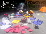 ザックを開けてカッパとテントを出して、 み〜んな地べたに並べちゃいます。 ユラユラかげろうができるくらいに、 イッキに乾いていきます。 しかし、3日もおフロに入っていないので、 かなりクサクサです、頭もかいかい〜 |