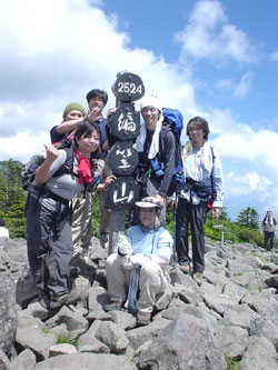 ![]() 上:山頂まであとひといきっ。 右:いつもの儀式。 ![]() 全員無事登頂の図。 |