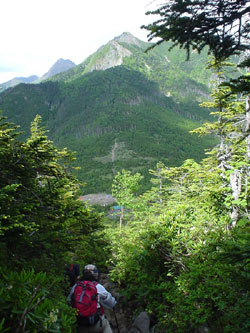 ![]() 下りきったところに青年小屋、 手前が権現岳、奥が赤岳。 |