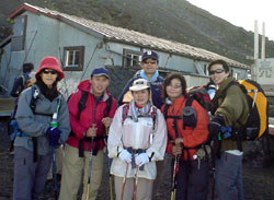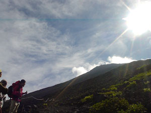 | まあ、今日は7合目で宿泊なので 気は楽ちん、出て来たお日さまと 青空で、気持ちよくのんびり のんびり歩いて、16:25に 太陽館に到着。 しかし、晴れたものの 強風は変わらず、 脱いだ上着は ばたばたと飛ばされそうになるわ 帽子とかもすっ飛ばされている人 多数。。。 受付で先払いの料金を支払い 混雑しているので順番待ちで しばし外にいると、 まだまだ上を目指す人も多い… |