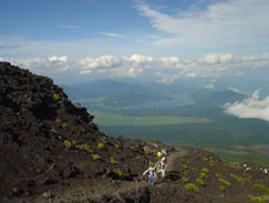 なにごともなかったように クルマに乗り込みさぁ出発〜、 中央道は3連休とあってそこそこの混雑。 須走I.C.からふじあざみラインへ、 駐車場からあふれて路上駐車が ものすごいイッパイ。 でも帰る車も多いので駐車場まで行ってみる、 すると、予想通り帰ったクルマ分空きがあります すかさず駐車っ、須走口5合目駐車場 11:00ころ到着。 |