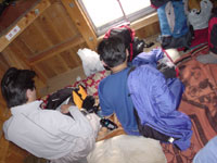 | いいかげん寒くてガタガタしはじめた頃 ようやく小屋に入れ、私ら6人は 1F2Fロフトあるなかの2Fとロフトの 2区画を割り当てられる。 上がぢょし、下がだんしね、と割り振る。 のちのち後から人が入ってきて だんしのスペースはふとん4枚に 6人というかわいそうなことになる… ぢょしスペースは布団は ひとり1枚だったので ヒジョーにラッキー。 |