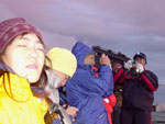 それぞれカメラ片手に いいポイントを 陣取ります(重要)。 低い位置に雲があるので 日の出時間より 30分ほど遅れて壮大なご来光が 差してきました♪ おぉ〜っと周りから歓声と 拍手とカメラのシャッター音! |