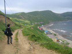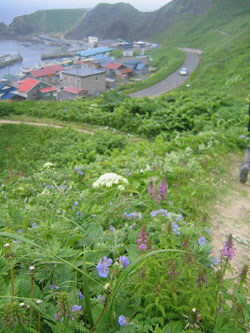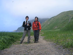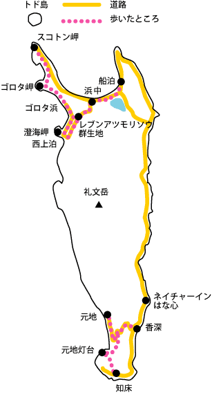 今日1日で見たい花を 見れるだけ見よう!と いうことでちょっとキツい 変形8時間コースを計画。 前半をスコトン岬から 澄海(スカイ)岬へ行き 浜中へ向かう途中で レブンアツモリソウを見学、 そしてここからバスで 香深へ出て、 猫台・桃台を見学して 元地に向かい、ウニ丼。 戻って、桃岩展望台から 元地灯台に行く フラワーロードへ、 最終的に知床へ抜けて ココからバス、もしくは タクシーで宿へ戻るという 計算したら19kmほどある ハードなトレッキング。 へなねえには、みどころと 給油ポイント(びぃるを 売ってるトコロ)をしっかり ガイドしてもらう約束をして、 いざ、しゅっぱーつ♪ |