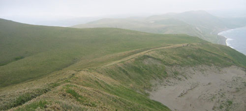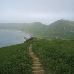 | 突風に吹き飛ばされそうに なりながら、がけっぷちを歩く。 ここからお花がいっぱい♪ 民家の軒先を歩いたり、海岸っぺりを 歩いたり、変化のあるコースが 楽しめます。 標準タイムはかなりゆっくりに 計算されていたようで、 足ののろい私が写真を撮りながらでも 早いくらいでした。 ゴロタ岬に来た辺りで、霧が出て来て 視界が悪くなってきました。 |
