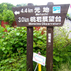 | えー、雨ぇ〜?いやだなぁ。 と思っていたら香深到着です、 とりあえずフェリーターミナルへ入って 利尻島行きのフェリー乗船前で ごったがえしていたけれど お構いなしに、かっぱとスパッツを装着。 これでドザーーーッと降られても ダイジョウブ♪ と、桃岩展望コースへと歩きはじめます。 地元の小学生の書いた看板になごみながら 途中、コースをはずれて桃岩の (タイム)トンネルを抜けて 元地海岸方面へ向かいます。 |