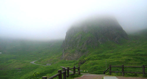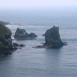| トンネルを抜けてくねくねした舗装道路を降りて、桃台・猫台なる展望台に登る。 眼下には猫岩と桃岩荘の赤い屋根、振り返ると うーん…ガスでてっぺんが見えない桃岩。 まぁ、気を取り直して元地海岸へ、 てくてく海沿いの道を歩く、途中カモメがすぐ近くをぷかぷかしてたりして なんだかとっても、のどかー。。。 |