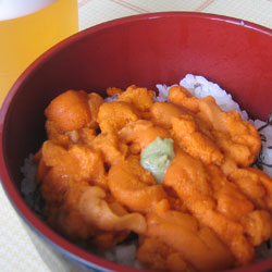 海岸沿いの道の最後に ウニ丼発祥の店で有名な 『佐藤売店』さんがあります。 へなねえには内緒にしてたんだけど ぢつは私、ウニがあんまり 好きじゃないんです(ーー; でも、おいしいのを食べたことがない、 それは確信していたので 克服のために、いちばんウニの量の多い 『スペシャル丼』を頼んじゃう! もちろん生びぃるもね♪ びぃるを呑っていると、 やってきました、『スペ丼』様。 一面鮮やかなオレンジ色だよー、 すごーい。 |