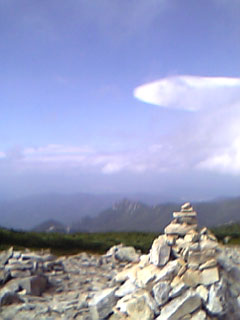 朝日岳からガレた下り坂を降りると、 しばらくはしばし平坦な道を歩く。 調子がでているのでほぼスキップ状態♪ 最後にちょっとした登りがあって、 そこを登りきると 森林限界を超えた殺風景な光景が広がります。 ハイマツとシャクナゲ以外は ケルン(積んである石)と、ガレガレの山頂と 大勢の登山客ばかり。 |