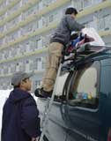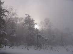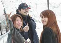 雪道に入り、じゃりじゃりと走っているとSが 「…ビニール袋ある?」「?!!」キモチ悪くなったらしい、 いそいで車をとめてもらい雪中へ胃液を吐くS、顔面蒼白…大丈夫かコイツ? でもここはすでに雪がたくさん! 降りたついでに、わんこのように雪を踏んで楽しみます♪ |