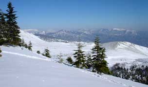 白根山登山道からの眺めを楽しみます、 この日もスノーシューを履いた方々が白根山山頂へ 向かっていきます。 ここから歩いて30分くらいとの事、 「行ってくれば?」とTさん、でも時間も体力も 余裕がないのでやめておきました、白根山は夏にまた来たいな、 お釜めぐりもしたいし。 このあと何本かロングコースを滑り、お昼ころあがります。 |