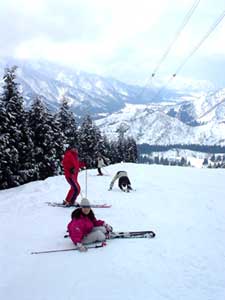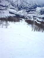 | まずはゴンドラに乗るためにリフトに乗り、 ゴンドラに乗り換えて、山頂を目指します。 ギュウギュウ詰めの通勤ラッシュ状態でしばしガマンののち、到着。 準備体操をして、すぐ下を見ると、いきなり荒れ荒れの深〜いコブ急斜面。 「う〜ん…」1本目だし足慣らしにフラット(っぽい)斜面滑りましょう、と 他のコースへ、コブもないし、るんるん♪と滑りはじめると 「あら?重い…」暖かいせいで雪がとけているみたい。 ターンするのがめんどくさくなるほど、重雪です。 コースの途中でコブコブが出てきて、滑っていると汗が出てきます。 「あぢー」みんなも汗をかいている様。 |