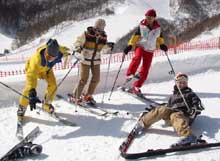 | 何本か滑って国体男子コースを滑っていると、途中で片足立ちのオジさんがいます、 よくよく見るとその片方の足は靴下です。「このへんで板見なかったかな〜?」 どうやら転倒した時にブーツごと板が行方不明になったそうです。近辺を探すが見当たりません、 オジさんに「下にあったら声かけますね」と言い残し下へ、 すると板がありました!オジさんに大きな声で「あったよ〜〜〜〜〜っ!!」と声をかけ みんなで板を中心に記念撮影、すると 立ててあった板はパタリと倒れてしまい、またまた滑りだしました ちょうど下にいたCさんがナイスキャッチ! またそこに板をしっかり刺して、またまた滑り出します。 |