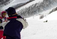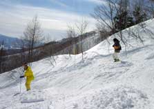お次はエキスパートコースです、 上部は40°も傾斜があります。 どきどきしながらチャレンジ! 滑るというより、「きゃー」と 転がり落ちたというべき感じです。 でもコブにぶつかって 止まるからまだいいか。 AHさん&Kさんはすいすいと 降りて行きます、さすがです。 |