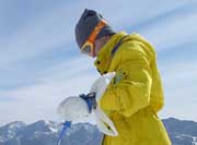 | まずは足慣らしに白樺コースから国体女子(沢)コースを 滑ります、お日さまぽかぽかとっても暖かです、 ホントに2月なのかしら?? インナーがフリースなのが 恨めしいほどの陽気、Tさん持参の気温計は5℃をさしています、 そして雪はやや重です、 ターンに気をつけないとコケちゃいます、 Cさんさっそく転倒。 証拠写真を撮られてしまいます。 |