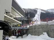 | 急坂を登って駐車場までいくと、すでに汗が吹き出してきました(><) 車から板を降ろしながら、う〜ん、失敗したかな。 ふぅふぅ言いながら、またまた急坂を登って、10:00長坂ゴンドラ駅でリフト券購入ののち、すぐにゴンドラへ。 |