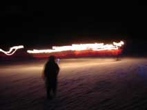 松明のジャグリングも終わり、静かになりました。 いよいよ松明滑走です、しかし 滑ってくる隊列はバラバラ、「????」 なんでだろう、そんなヘタッピにはやらせないだろ? と思っていたら、スノーボードでの松明滑走です! う〜ん、きれいな隊列で滑るのは難しいのかな。 その後にスキーでの松明滑走、 こちらは美しいラインで滑っていきます。 |