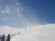 やっぱり足がなまくらになっているわー! それでも、2本目はがんばって コブ斜面にアタック、へなちょこ滑りながらも やっぱりスキーは楽しい♪ 兎平はすでに荒れて、深いコブになっていたので 黒菱へ移動、さっきより急な斜度だけれど 深さはそれほどでない場所もあるので がんばって、ぴょんぴょんうさぎちゃん になってコブを滑ります、 しかし、私とちんさんだけが初滑り、 みんなコブコブアタックをガンガンやっているけど 足がついていかなくなっちゃいました。。。 そんなんで、滑っていると 山頂行きのグラードクワッドが動き始めたので さっそく行くことに! コブないしね(笑) たまに『ぐわん』とリフトは揺れながら山頂へ、 「寒っ」 リフトから降りて少し登り坂があるのに 漕がなくてもスキーがすすむくらいの強風。 |