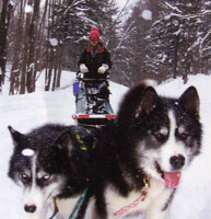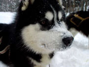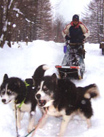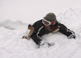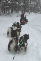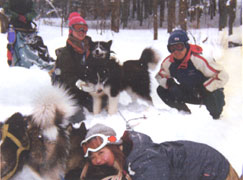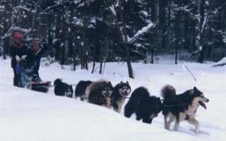 | 木の箱に犬たちを入れて、人も犬も同じトラックに揺られて2キロほど離れた林道へ。 スタッフの方が先導のスノーモービルを取りに行っている間、新雪にダ〜イヴ! 埋もれて出るのがタイヘン。そんな遊びをしているうちに、 ちょっと不調だった(らしい)スノーモービルくんがやってきました。 |