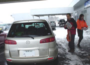 日程が一緒だったので、今回の旅に(断じて強要はしていません(笑)) 同行してくれたTOMOEさん(のんびりしようよ!!)との 待ち合わせのレンタカー受付へ、旅のお供はマツダのデミオくん。 レンタカー屋さんのバスで移動してキーを受け取り 犬ぞり体験をさせてくれる『どんころ野外学校』のある トマムへ10:00すぎに出発! 予約した犬ぞりは午後の半日コース、 13:00からなので時間短縮のために高速へ、 思いのほか暖かく無風で雪も降っていないので、 TOMOEさんは運転楽ちんそう(ごめんなさいね、車はペーパーなもので) 途中日高のセイコーマートでお昼を食べて、 13:30には雪の平原のなかにある、どんころのログハウスに到着。 はらはらと雪が降ってきました、 気温はマイナス7℃、今日は暖かいんだって。 室内で受付と料金を支払いをして、スパッツを忘れてしまったので長靴を借り、外へ。 |
