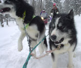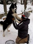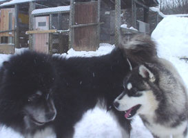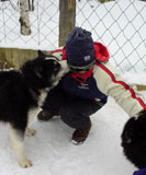 | もう、これがもうすごいのなんのって。 遊んで遊んで〜と14頭の大きな犬たちが飛んできます(^^; 彼らに突き飛ばすつもりはなくても、 でかい図体で突進されると、さすがに転げてしまいます。 そーなると大変! みんなでよってたかって、ぺろぺろとなめられます。 なので、スノーウエアはすっかり犬くさくなってしまいました。 (獣の匂いがつくのが気になる人は、レンタルのウェアもありましたよ) ひとしきり遊んで、みんなにごはんをあげて ログハウスに戻りココアをいただきながら、 1泊2日の雪中キャンプの犬ぞりコースもあると聞き、 ぜひとも来年はわんこ達とキャンプしよっかなぁ、と 新たな野望を胸にどんころを後にしました。 どんころのスタッフのお二人にはお世話になりました(^^) 二人の写真を撮り忘れた私はかなり迂闊です。。。。 |