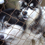 | 「今日の客はこいつらか?」と いう犬たちの視線を受けながら、 スタッフの方から犬ぞりの扱い方や、犬とのスキンシップの とりかたなどなどを教わって犬舎の中へ、 全部で14頭いるシベリアンハスキー犬たちとご対面。 彼等にとって、犬ぞりはお散歩と同じで 楽しいことらしく、みんなテンションが高い(笑) 「俺を連れてけ」「私を連れてけ」と言わんばかりに、 がうがう言って、しっぽを振っています。 |